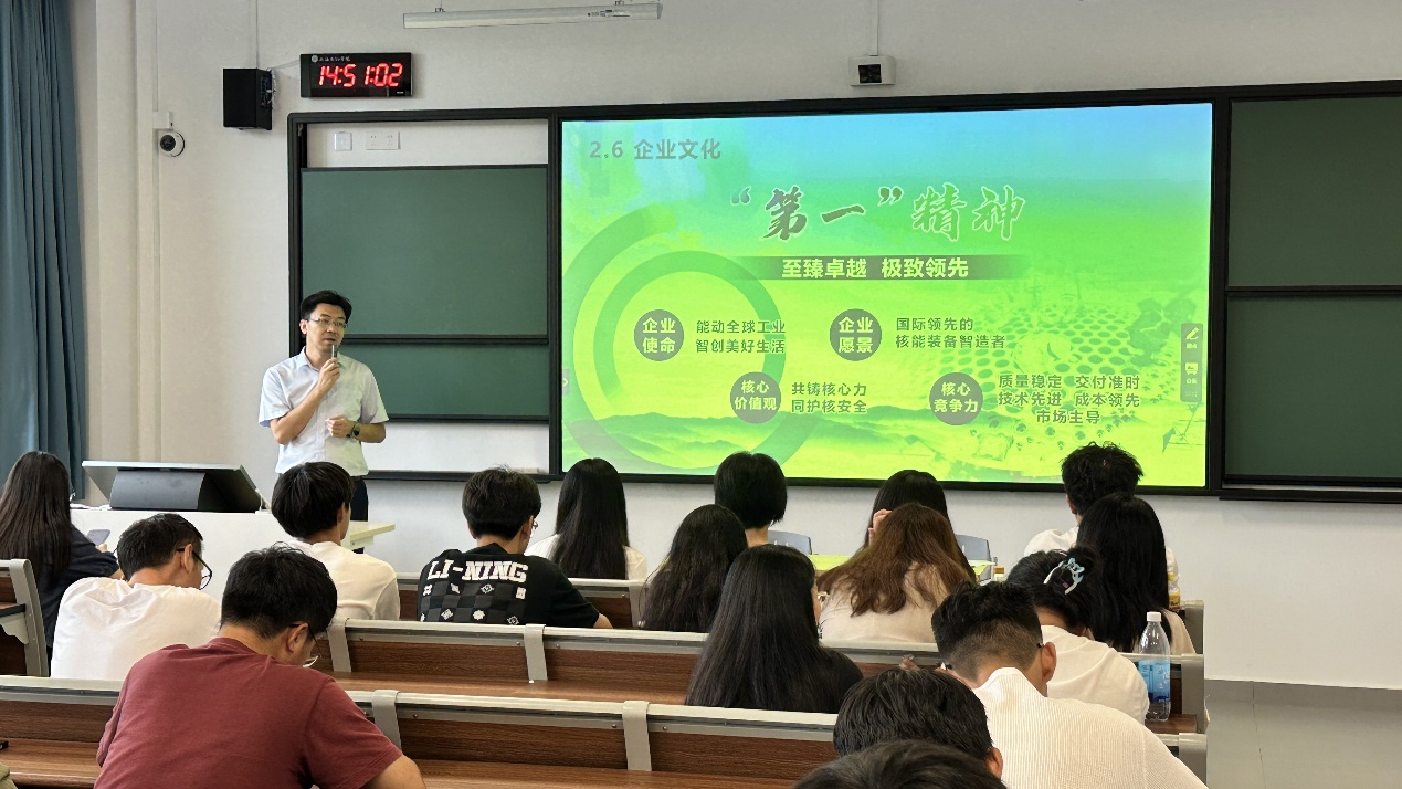 上海第一机床厂有限公司隶属于上海电气核电集团,2024年荣获首批“国家卓越工程师团队”称号。楼杭飞书记从第一机床厂的发展、产品介绍、团队成员与各高校合作的项目情况和企业文化“第一精神”为同学们做了报告,介绍了公司主产品核电站工作原理,对与机械相关的堆内构件制造工艺和控制棒驱动机构进行了重点介绍,介绍了机械工程师在攻克技术难题时所具备的精神和实际行动,使同学们对工程师精益求精的精神内涵有了更深入的了解,提升了同学们对现场工程师更直观的认识。